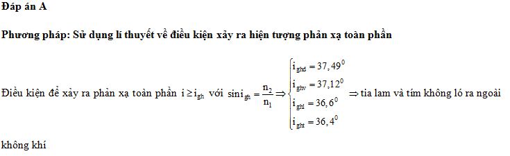 Chiếu một chùm sáng song song hẹp gồm bốn thành phần đơn sắc: đỏ, vàng, lam và tím từ một môi trưòng trong suốt tới mặt phẳng phân cách với không khí có góc tới 37°. Biết chiết suất của môi trường này đối với ánh sáng đơn sắc: đỏ, vàng, lam và tím lần lượt là 1,643; 1,657; 1,672 và 1,685. Thành phần đơn sắc không thể ló ra không khí là