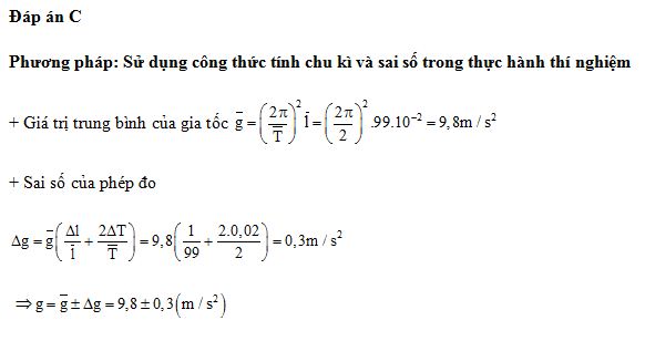 Tiến hành thí nghiệm đo gia tốc trọng trường bằng con lắc đơn, một học sinh đo được chiều dài con lắc đơn là 99 ± 1 (cm), chu kì dao động nhỏ của nó là 2,00 ± 0,02 (s). Lấy π2 = 9,87 và bỏ qua sai sốcủa số π. Gia tốc trọng trường do học sinh đo được tại nơi làm thí nghiệm là