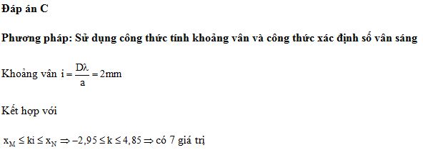 Trong thí nghiệm Y-âng về giao thoa với ánh sáng đơn sắc có bước sóng 0,6 μm. Biết khoảng cách giữa hai khe là 0,6 mm, khoảng cách từ mặt phẳng chứa hai khe đến màn quan sát là 2 m. Trên màn, hai điểm M và N nằm khác phía so với vân sáng trung tâm, cách vân trung tâm lần lượt là 5,9 mm và 9,7 mm. Trong khoảng giữa M và N có số vân sáng là