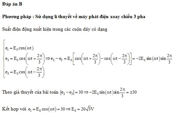 Một máy phát điện xoay chiều ba pha đang hoạt động ổn định. Suất điện động trong ba cuộn dây của phần ứng có giá trị el, e2 và e3. Ở thời điểm mà e1 = 30 V thì |e2 - e3| = 30 V. Giá trị cực đại của e1 là