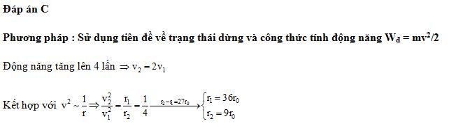 Xét nguyên tử hiđrô theo mẫu nguyên tử Bo. Electron trong nguyên tử chuyển từ quỹ đạo dừng m1 về quỹ đạo dừng m2 thì bán kính giảm 27r0 (r0 là bán kính Bo), đồng thời động năng của êlectron tăng thêm 300%. Bán kính của quỹ đạo dừng m1 có giá trị gần nhất với giá trị nào sau đây?