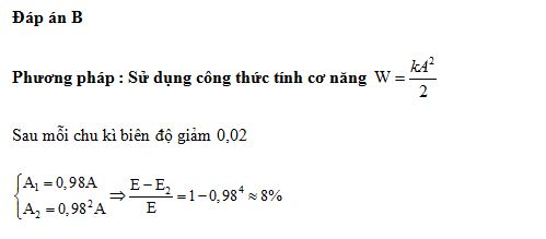 Một con lắc lò xo dao động tắt dần trên mặt phẳng nằm ngang. Cứ sau mỗi chu kì biên độ giảm 2%. Gốc thế năng tại vị trí của vật mà lò xo không biến dạng. Phần trăm cơ năng của con lắc bị mất đi trong hai dao động toàn phần liên tiếp có giá trị gần nhất với giá trị nào sau đây?