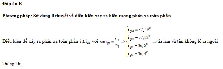 Chiếu một chùm sáng song song hẹp gồm bốn thành phần đơn sắc: đỏ, vàng, lam và tím từ một môi trưòng trong suốt tới mặt phẳng phân cách với không khí có góc tới 37°. Biết chiết suất của môi trường này đối với ánh sáng đơn sắc: đỏ, vàng, lam và tím lần lượt là 1,643; 1,657; 1,672 và 1,685. Thành phần đơn sắc không thể ló ra không khí là