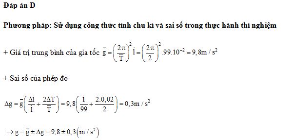 Tiến hành thí nghiệm đo gia tốc trọng trường bằng con lắc đơn, một học sinh đo được chiều dài con lắc đơn là 99 ± 1 (cm), chu kì dao động nhỏ của nó là 2,00 ± 0,02 (s). Lấy π2 = 9,87 và bỏ qua sai số của số π. Gia tốc trọng trường do học sinh đo được tại nơi làm thí nghiệm là