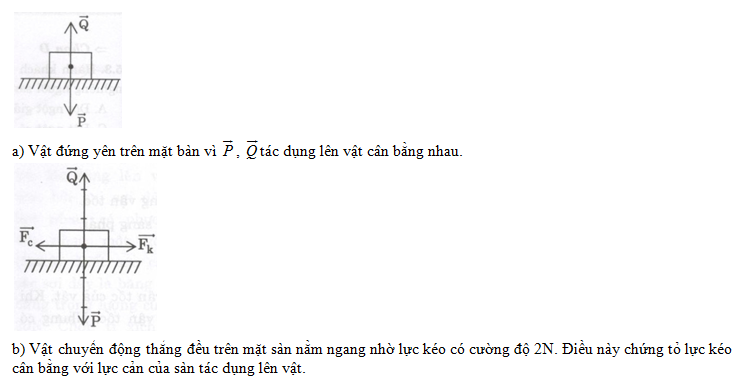b) Nếu vật được kéo chuyển động thẳng đều trên mặt sàn nằm ngang, có cường độ 2N. Hãy biểu diễn các vectơ lực tác dụng lên vật. Chọn tỉ xích 2N ứng với 1cm.
