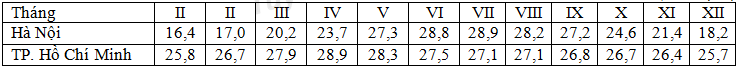 Căn cứ vào bảng số liệu, cho biết nhận xét nào sau đây không đúng về nhiệt độ của Hà Nội và TP. Hồ Chí Minh?