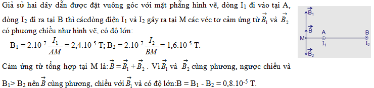 Hai dây dẫn thẳng, rất dài, đặt song song, cách nhau 10 cm trong không khí, có hai dòng điện ngược chiều, có cường độ I1 = 6 A; I2 = 12 A chạy qua. Xác định cảm ứng từ tổng hợp do hai dòng điện này gây ra tại điểm M cách dây dẫn mang dòng I1 5 cm và cách dây dẫn mang dòng I2 15 cm.