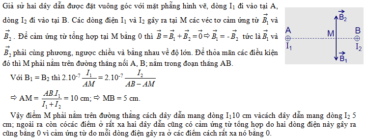 Hai dây dẫn thẳng, rất dài, đặt song song, cách nhau 15 cm trong không khí, có hai dòng điện cùng chiều, có cường độ I1 = 10 A,I2 = 5 A chạy qua. Xác định điểm M mà tại đó cảm ừng từ tổng hợp do hai dòng điện này gây ra bằng 0.