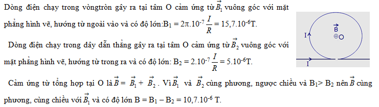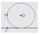 Một dây dẫn thẳng, dài có vỏ bọc cách điện, ở khoảng giữa được uốn thành vòngtròn, bán kính R = 20 cm như hình vẽ. Dòng điện chạy qua dây dẫn có cường độ 5 A. Xác định cảm ứng từ tại tâm O của vòng tròn
