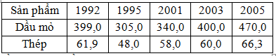 Cho bảng số liệu: Sản lượng dầu mỏ, thép của Liên Bang Nga thời kì 1992- 2005 (Đơn vị: