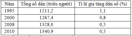 Cho bảng số liệu: Tổng số dân và tình hình tăng dân số Trung Quốc thời kì 1995 - 2010 Để