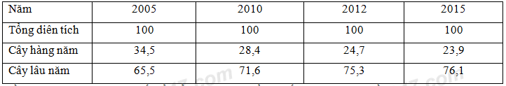 Biểu đồ nào sau đây thích hợp nhất để thể hiện sự thay đổi cơ cấu diện tích cây trồng hàng năm và lâu năm giai đoạn 2005-2015 theo bảng số liệu trên?