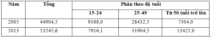 Lực lượng lao động từ 15 tuổi trở lên phân theo nhóm tuổi ở nước ta năm 2005 và năm 2013