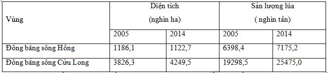 Nhận xét nào sau đây không đúng về diện tích và sản lượng lúa cả năm của Đồng bằng sông Hồng và Đồng bằng sông Cửu Long năm 2005 và năm 2014?