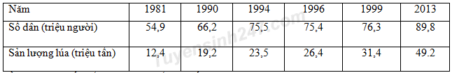 Cho bảng số liệu: Số dân và sản lượng lúa ở nước ta thời kì 1981 – 2003 Biểu đồ thích