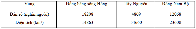 Cho bảng số liệu sau DIỆN TÍCH VÀ DÂN SỐ MỘT SỐ VÙNG NƯỚC TA NĂM 2006 (Nguồn: Niên giám