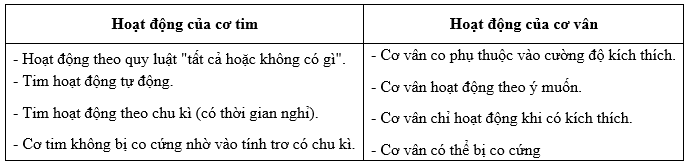 Ý nào không phải là sự sai khác về hoạt động của cơ tim so với hoạt động của cơ vân?