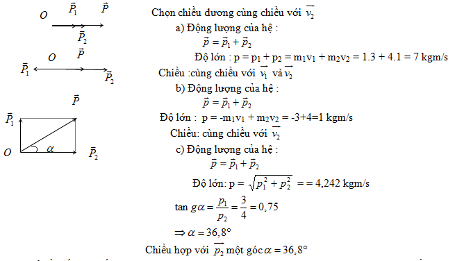 Hai vật có khối lượng m1 = 1 kg, m2 = 4 kg chuyển động với các vận tốc v1 = 3 m/s và v2 = 1 m/s. Tìm tổng động lượng ( phương, chiều và độ lớn) của hệ trong các trường hợp :