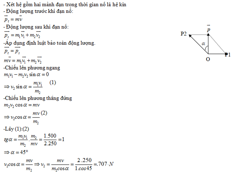 Một viên đạn có khối lượng 2 kg đang bay thẳng đứng lên cao với vận tốc 250m/s thì nổ thành 2 mảnh có khối lượng bằng nhau. Biết mảnh thứ nhất bay theo phương nằm ngang với vận tốc 500m/s, hỏi mảnh kia bay theo phương nào với vận tốc bao nhiêu?