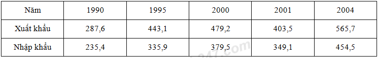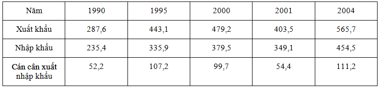 Tính cán cân xuất nhập khẩu của Nhật Bản qua các năm. Biểu đồ thích hợp nhất thể hiện giá trị xuất, nhập khẩu qua các năm của Nhật Bản là biểu đồ gì ?(1,5 điểm)