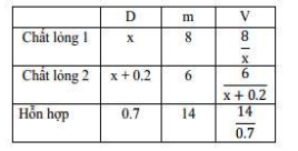 Trong một giờ thực hành được phụ trách bởi thầy Tưởng, nhóm bạn Quân, Minh, Tý đã trộn 8g một chất lỏng A với 6g một chất lỏng B để được một hỗn hợp C, biết khối lượng riêng của chất lỏng B lớn hơn khối lượng riêng của chất lỏng A là 0,2g/cm3 và hỗn hợp C có khối lượng riêng là 0,7g/cm3. Tìm khối lượng riêng của mỗi chất lỏng A, B ? ( kết quả làm tròn đến số thập phân thứ 2)