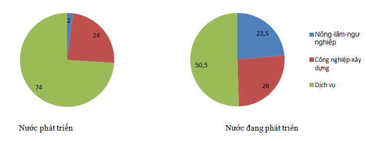 Vẽ biểu đồ thể hiện cơ cấu GDP phân theo khu vực kinh tế của 2 nhóm nước năm 2016. Từ đó rút ra nhận xét