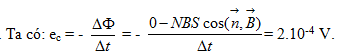 Một khung dây phẵng diện tích 20 cm2, gồm 10 vòng được đặt trong từ trường đều. Véc tơ cảm ứng từ làm thành với mặt phẵng khung dây góc 300 và có độ lớn bằng 2.10-4 T. Người ta làm cho từ trường giảm đều đến 0 trong thời gian 0,01 s. Tính suất điện động cảm ứng xuất hiện trong khung dây trong thời gian từ trường biến đổi.