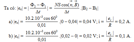 Một khung dây hình chữ nhật kín gồm N = 10 vòngdây, diện tích mỗi vòng S = 20 cm2 đặt trong một từ trường đều có véc tơ cảm ứng từ\(\overrightarrow B \) hợp với pháp tuyến \(\overrightarrow n \) của mặt phẵng khung dâygóc a = 600, độ lớn cảm ứng từ B = 0,04 T, điện trở khung dây R = 0,2 W. Tính độ lớn suất điện động cảm ứng và cường độ dòng điện xuất hiện trong khung dây nếu trong thời gian Dt = 0,01 giây, cảm ứng từ: