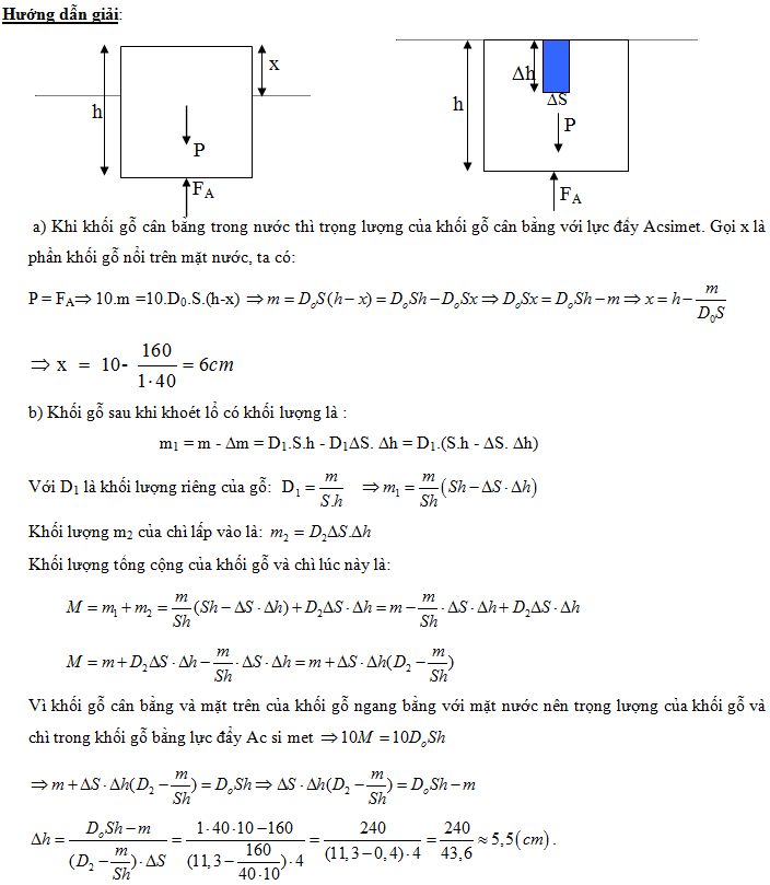 b) Bây giờ khối gỗ được khoét một lỗ hình trụ ở giữa có tiết diện DS = 4 cm2, sâu Dh và lấp đầy chì có khối lượng riêng D2 = 11 300 kg/m3(= 11,3 cm3 ) khi thả vào trong nước người ta thấy mực nước bằng với mặt trên của khối gỗ. Tìm độ sâu Dh của lỗ.