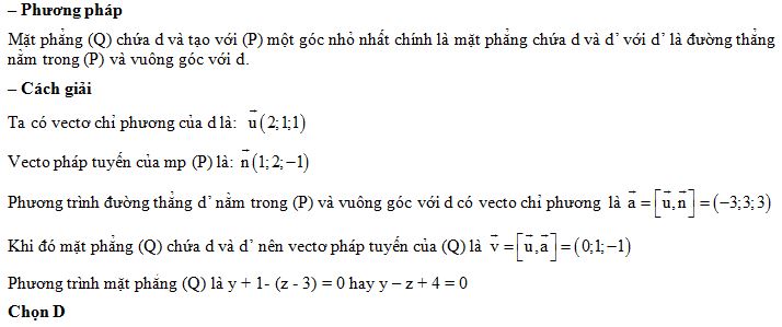 Trong không gian với tọa độ Oxyz , cho đường thẳng \(d:\frac{{x + 1}}{2} = y + 1 = z - 3\) và mặt phẳng \(\left( P \right):x + 2y - z + 5 = 0\). Mặt phẳng (Q) chứa đường thẳng d và tạo với (P) một góc nhỏ nhất có phương trình.