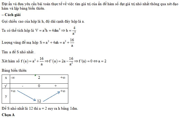 Người ta muốn mạ vàng cho bề mặt phía ngoài của một cái hộp dạng hình hộp đứng không nắp (nắp trên), có đáy là một hình vuông. Tìm chiều cao của hộp để lượng vàng phải dùng để mạ là ít nhất, biết lớp mạ ở mọi nơi như nhau, giao giữa các mặt là không đáng kể và thể tích của hộp là \(4 dm^3\) .