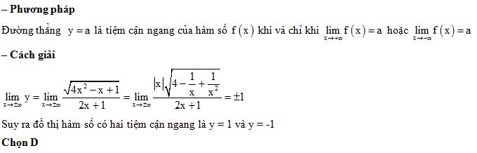Cho hàm số \(y = \frac{{\sqrt {4{x^2} - x + 1} }}{{2x + 1}}\) . Tiệm cận ngang của đồ thị hàm số có