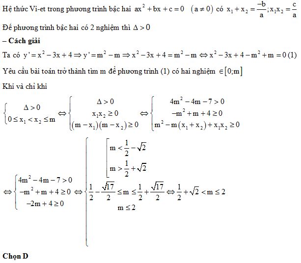 Cho hàm số \(y =\frac{{{x^3}}}{3} - \frac{3}{2}{x^2} + 4x + 2017\). Định m để phương trình \(y' = {m^2} - m\) có đúng hai nghiệm thuộc đoạn \(\left[ {0;m} \right]\)