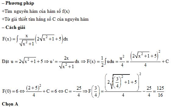 Cho \(f\left( x \right) = \frac{x}{{\sqrt {{x^2} + 1} }}\left( {2\sqrt {{x^2} + 1} + 5} \right)\), \(F\left( 0 \right) = 6\) . Biết F(x) là một nguyên hàm của f(x) thỏa mãn. Tính \(F\left( {\frac{3}{4}} \right)\)