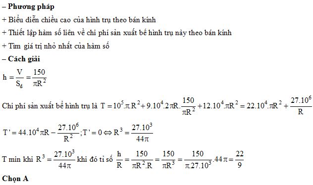 Gia đình An xây bể hình trụ có thể tích \(150 m^3\) . Đáy bể làm bằng bê tông giá \(100000 \text{đ} /m^2\) . Phần thân làm bằng tôn giá \(90000\text{đ} /m^2\), nắp bằng nhôm giá \(120000\text{đ} /m^2\). Hỏi khi chi phí sản suất để bể đạt mức thấp nhất thì tỷ số giữa chiều cao bể và bán kính đáy là bao nhiêu?