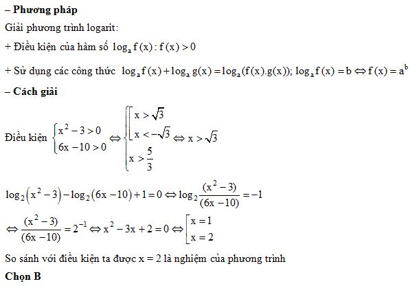 Số nghiệm của phương trình \({\log _2}\left( {{x^2} - 3} \right) - {\log _2}\left( {6x - 10} \right) + 1 = 0\)
