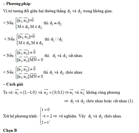 Trong không gian với hệ tọa độ Oxyz. Cho hai đường thẳng\({{\rm{d}}_1}:\left\{ {\begin{array}{*{20}{c}}{x = t}\\{y = - t}\\{z = 1}\end{array}} \right.\) và \({{\rm{d}}_2}:\left\{ {\begin{array}{*{20}{c}}{x = 0}\\{y = 2}\\{z = t'}\end{array}} \right.\). Khẳng định nào sau đây là đúng?