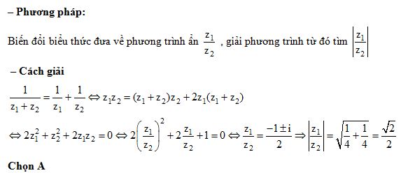 Cho hai số phức \(z_1; \, z_2\) thỏa mãn \({{{z}}_1},{z_2} \ne 0;{z_1} + {z_2} \ne 0;\frac{1}{{{z_1} + {z_2}}} = \frac{1}{{{z_1}}} + \frac{2}{{{z_2}}}\) . Tính \(\left| {\frac{{{z_1}}}{{{z_2}}}} \right|\)