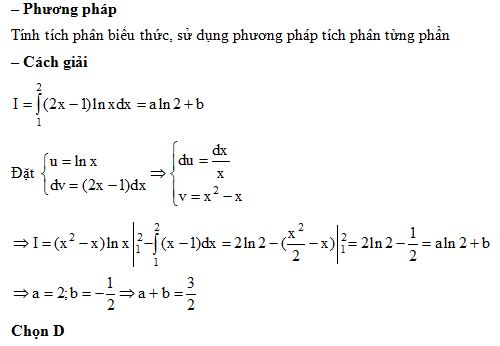 Giả sử \(\int\limits_1^2 {\left( {2x - 1} \right)} \ln xdx = a\ln 2 + b\left( {a;b \in Q} \right)\). Khi đó a +
