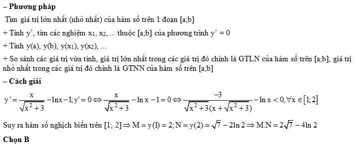 Cho hàm số \(y = \sqrt {{x^2} + 3} - x\ln {\rm{x}}\) . Gọi M, N lần lượt là giá trị lớn nhất, nhỏ nhất của hàm số trên đoạn [1;2]. Khi đó tích M.N là: