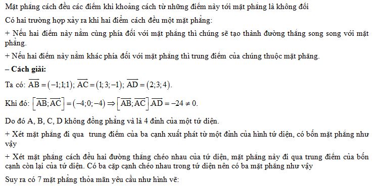 Trong không gian với hệ tọa độ Oxyz, cho bốn điểm \(A\left( {1; - 2;0} \right);B\left( {0; - 1;1} \right);C\left( {2;1; - 1} \right);D\left( {3;1;4} \right)\) . Hỏi có bao nhiêu mặt phẳng cách đều bốn điểm điểm đó?
