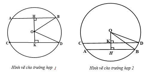 Đây là một bài tập rất hay về đường tròn và khoảng cách của hai dây cung. Các em phải biết được khoảng cách 2 dây là đường vuông góc chung của hai dây ( đường thẳng đồng thời vuông góc với hai dây cung)