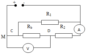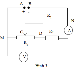 a, Cho mạch điện như hình 3, trong đó hiệu điện thế giữa A và B không đổi là U, Rb là một biến trở. Dịch chuyển con trỏ C của biến trở thì thấy số chỉ của ampe kế thay đổi từ 0,08A đến 0,2A và số chỉ của vôn kế V thay đổi từ 1,6V đến 20,8V. Tìm giá trị của U, R1 và Rb. Cho biết ampe kế A có điện trở không đáng kể. Coi các điện trở không thay đổi theo nhiệt độ.