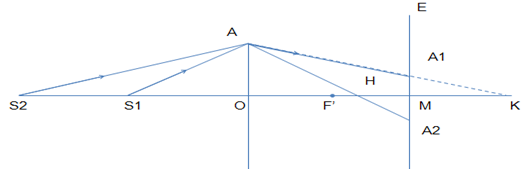 2) Điều chỉnh SO = 30cm rồi đánh dấu kích thước vệt sáng trên màn. Nếu di chuyển S trên trục chính của thấu kính một đoạn là x thì vệt sáng trên màn lại có kích thước như cũ. Tìm x và chiều di chuyển của S.