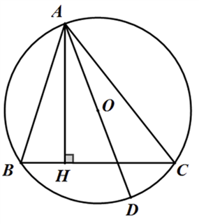 Cho \(\Delta ABC\) nội tiếp đường tròn \(\left( {O;R} \right)\) có độ dài các cạnh là \(AB = c,\,BC = a,\,CA = b\) kẻ \(AH \bot BC,\,\,AO\) cắt \(\left( O \right)\) tại \(D.\) Diện tích \(S\) của \(\Delta ABC\) là:
