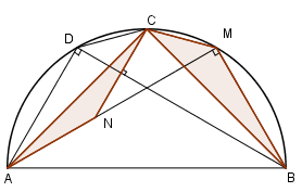Cho nửa đường tròn \(\left( O \right)\), đường kính \(AB\) và \(C\) là điểm chính giữa của cung \(AB.\) Lấy điểm \(M\) thuộc cung \(BC\) và điểm \(N\) thuộc tia \(AM\) sao cho \(AN = BM.\) Kẻ dây \(CD\) song song với \(AM.\) Gọi \({S_1}\), \({S_2}\) lần lượt là diện tích của tam giác \(\Delta ACN\) và \(\Delta BCM.\) Khi đó: