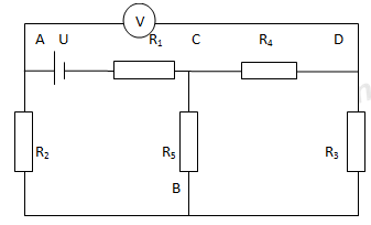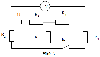 Cho mạch điện như hình 3; nguồn điện có hiệu điện thế không đổi U = 6V; các điện trở R1 = 1Ω; R2 = 1,8Ω; R3 = 2Ω; R4 = 1Ω; R5 = 2Ω; vôn kế có điện trở rất lớn; điện trở khoá K và các dây nối rất nhỏ.