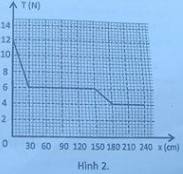 Hình 2 là đồ thị biểu diễn sự phụ thuộc của lực căng dây treo vật M theo độ sâu x của M (x được tính từ mặt thoáng của xăng trong bể đế đáy dưới của vật M). Cho rằng vật M không làm thay đổi mực nước và mực xăng trong bể.