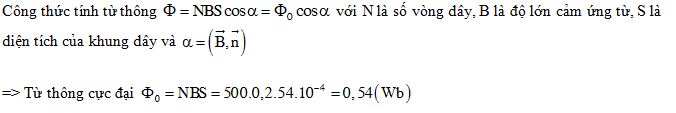 Một khung dây dẫn phẳng dẹt hình chữ nhật có 500 vòng dây, diện tích mỗi vòng 54cm2. Khung dây quay đều quanh một trục đối xứng( thuộc mặt phẳng của khung), trong từ trường đều có vec tơ cảm ứng từ vuông góc với trục quay và có độ lớn 0,2T. Từ thông cực đại qua khung dây là