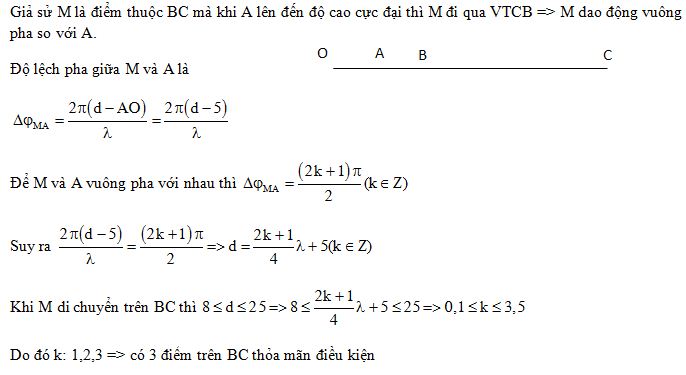 Một sóng truyền thẳng từ nguồn điểm O tạo ta bước sóng bằng 10 cm. Xét ba điểm A, B, C cùng phía so với O trên cùng phương truyền sóng lần lượt cách O 5cm, 8 cm và 25 cm. Xác định trên đoạn BC những điểm mà khi A lên độ cao cực đại thì những điểm đó qua vị trí cân bằng.